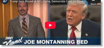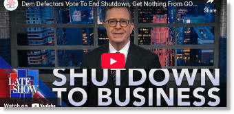 Trump Gets Booed at NFL Game, Democrats Cave on Government Shutdown & It's 80s Week at Kimmel! | jimmy Kimmel | 11/10/25 | 14:14 Dem Defectors Vote To End Shutdown, Get Nothing From GOP | Trump Stadium | Asleep In The Oval Office | Stephen Colbert | 11/10/25 | 12:59 |