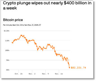Crypto plunge wipes out nearly $400 billion in a week A plunge in cryptocurrency assets accelerated Friday morning, led by bitcoin, which has lost more than a third of its value since setting an all-time high in October. Why it matters: The bloodbath has left no corner of the market untouched, and is reviving the debate about crypto as a long-term asset. By the numbers: Bitcoin fell as low as $81,919 early Friday, per CoinGecko data, off more than 10% in 24 hours to the lowest levels since April. In early October the original cryptocurrency set a record when it broke $126,000 for the first time. Bloomberg reported the coin is on track for its worst month since June 2022, which was a catastrophic period for the industry. ... Read more