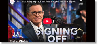 Did Trump Really Sign Epstein Files Bill? | Pam Bondi's Flip Flop | Sean Duffy's Travel Advice | Stephen Colbert | 11/21/25 | 12:22 Trump Calls for Jimmy Kimmel to Be Fired AGAIN, Threatens Members of Congress & Signs Epstein Bill | Jimmy Kimmel | 11/21/25 | 12:35 |
