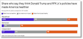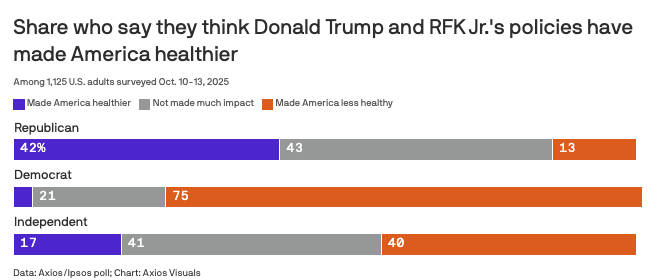 Axios-Ipsos poll: Trump, RFK Jr. lose America's trust on health care Americans who say the U.S. is less healthy under the leadership of President Trump and Health Secretary Robert F. Kennedy Jr. now outnumber believers 2-to-1, per the latest Axios-Ipsos American Health Index. The big picture: Skepticism over child vaccine requirements has ticked up since Trump took office in January, while Americans' trust in the Centers for Disease Control and Prevention, National Institutes of Health and Food and Drug Administration is declining. Driving the news: Confusion, suspicion and partisan cues are creating a deep divide between the public and the medical establishment, driven by the Trump administration's proposed changes to childhood vaccination schedules and promotion of an unproven link between Tylenol and autism. "It should be easier to make sense of how we live healthy lives - there's agreement across the board on that," said Mallory Newall, Ipsos vice president for U.S. public affairs. "There certainly is an erosion of trust, primarily driven by Democrats, but Republicans are not immune." ... ... ... Read more