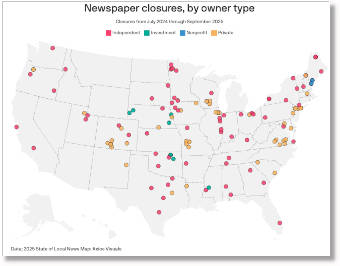 Independent newspapers disappear as private investment firms take over Newspapers owned by small, independent groups - often families or businesses invested in their local communities - are shuttering at an alarming pace compared to those owned by large investment companies, according to a new report from Northwestern's Medill School of Journalism. Why it matters: Independent newspapers are more likely to represent rural communities that are at greater risk of becoming "news deserts," or areas with extremely limited or zero access to local news sources. Zoom in: The erosion of small, independent newspapers means that the majority of remaining papers in the U.S. will be even more heavily concentrated among larger hedge funds and private-equity-backed groups that tend to be less invested in local communities. "The scary thing about that is that those are the owners that have been doing it, many cases, for decades," said Tim Franklin, a senior associate dean, professor and John M. Mutz Chair in Local News at Medill. "They're the most passionate about their publications, and even those folks are beginning to throw up their hands." ... Read more |