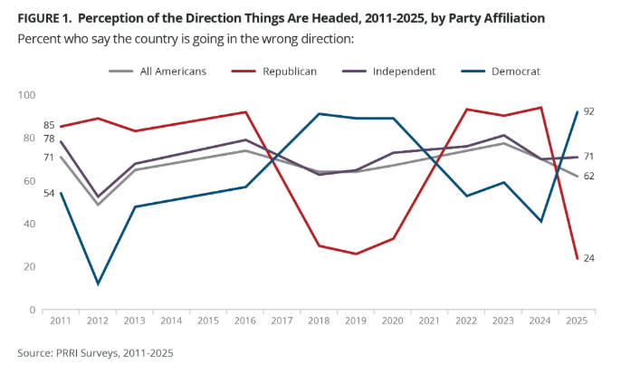 Most Americans say U.S. on wrong track on economy, immigration and more: poll Nearly two-thirds of Americans believe the U.S. is headed in the wrong direction, fueled by dissatisfaction with President Trump's impact on the economy, immigration, race relations and the nation's global standing, according to a new poll with a big, broad sample. Even among Republicans, a significant share - nearly 30% - gave Trump low marks on the economy and how the government is functioning. Why it matters: The survey offers a snapshot of the nation's sour mood just more than a year before the 2026 midterms - and suggests that anger could rewire political alliances and test the durability of Trump's support. ... ... ... Read more Good source, for above articleAmericans remain pessimistic about the country's direction and the state of the country, with sharp partisan reversals since 2024 | PRRI Meta slashes jobs in its AI operations Meta is cutting several hundred roles from its AI unit even as it continues to hire for its newer TBD Lab, Axios has learned. Why it matters: The company concluded that its long-standing AI efforts had become overly bureaucratic and hopes the reorganization will create a more agile operation, according to an internal memo seen by Axios. "By reducing the size of our team, fewer conversations will be required to make a decision, and each person will be more load-bearing and have more scope and impact," Meta chief AI officer Alexandr Wang wrote in the memo. Driving the news: Meta is cutting roughly 600 positions out of the several thousand roles within Meta's superintelligence lab. ... Read more