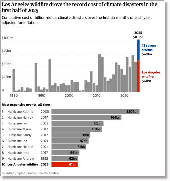Climate disasters in first half of 2025 costliest ever on record, research shows LA wildfires and storms this year cost $101bn, new study by non-profit resurrecting work axed by Trump says The first half of 2025 was the costliest on record for major disasters in the US, driven by huge wildfires in Los Angeles and storms that battered much of the rest of the country, according to a climate non-profit that has resurrected work axed by Donald Trump's administration that tracked the biggest disasters. In the first six months of this year, 14 separate weather-related disasters that each caused at least $1bn in damage hit the US, the Climate Central group has calculated. In total, these events cost $101bn in damages - lost homes, businesses, highways and other infrastructure - a toll higher than any other first half of a year since records on this began in 1980. The bulk of this toll was caused by the ferocious wildfires that razed parts of Los Angeles in January, a disaster that destroyed about 16,000 buildings and resulted in the indirect deaths of around 400 people. At $61bn in damages, the LA fires are one of the most expensive climate-related disasters on record in the US, and the only top 10 event that is not a hurricane. ... Read more |