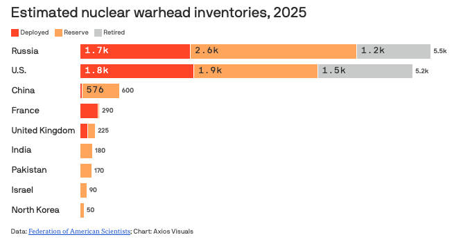 Why has the shutdown gone 31 days? Look at Mark Warner. The Virginia Democrat used to be a reliable participant in bipartisan Senate talks. This time, he doesn't see the point. Not so long ago, if there was a bipartisan group getting together to solve a problem in the Senate, you could count on Mark Warner to be involved. The Virginia Democrat was part of the "talking stick" gang that helped quickly end a brief 2018 funding lapse. He was a part of a crew that helped cut a major infrastructure deal under former President Joe Biden, and he's currently working with Republicans to forge an agreement on cryptocurrency regulation. But as his colleagues hunt for a way out of the 31-day-and-counting government shutdown, Warner this time is hanging on the sidelines. It's a twist not only because of Warner's history as a card-carrying bipartisan "gang" member who would frequently host gatherings at his Old Town Alexandria home. It’s also because of who he represents: His home state has the third-highest number of civilian government workers, plus tens of thousands more in military uniforms. Lawmakers from the Washington area have historically been voices of moderation urging both parties to avoid brinkmanship that could harm the federal workforce. ... Read more Trump muddles nuke-testing message President Trump's post announcing the U.S. would resume nuclear testing featured some inaccuracies, and introduced quite a bit of uncertainty. Why it matters: Nuclear rhetoric is closely scrutinized - by governments, by defense contractors, by outside analysts - and can have unintended consequences. Trump's Truth Social shocker will have generated significant debate in Moscow and Beijing over the past 24 hours. Reality check: Trump began his announcement by claiming the U.S. has more nukes than any other country. Russia, in fact, has the largest stockpile. ... Read more Trump sets lowest-ever refugee cap. See how other presidents compare. The Trump administration won't allow more than 7,500 refugees to enter America in FY2026, a record-low cap that prioritizes admitting Afrikaners, or white South Africans, into the country. Why it matters: The plunge cements the president's sharp pivot away from America's historic refugee policies and stands in stark contrast to the 125,000 refugees admitted under the last year of the Biden administration. What they're saying: "The Trump administration has long expressed its intention to end Biden's abuse of the refugee program," a senior administration official told Axios in an emailed statement. ... Read more