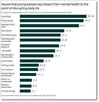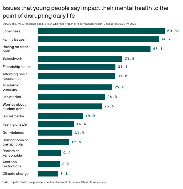 What's different about the Charlie Kirk firings Companies are reacting to pressure from Republican officials and right-wing activists and quickly firing anyone who attempts to justify or minimize the killing of Charlie Kirk — or even criticize the slain conservative activist. Why it matters: These firings could be legal, lawyers say, but they demonstrate fast-changing norms around free speech that many find troubling. They also signify an increased vigilance among employers when it comes to workers' social media posts. Where it stands: Dozens of such terminations have been publicly reported at media companies, airlines, sports teams and federal agencies. In the public sector, teachers, government workers and community officials have also been fired or put on leave in recent days due to their commentary on the violence. ... ... Read more Half of young people plagued by loneliness, family problems State of play: 55% of young people say their mental health is good, very good or excellent, according to the survey. But LGBTQ+ youth rate their mental health as poor at nearly triple the rate of non-LGBTQ+ youth. And those young people who struggle to meet basic expenses report poor mental health at more than triple the rate of those who live comfortably. Respondents said solo downtime, face-to-face time with friends and engaging with media are the top activities that support their well-being and mental health. ... ... Read more