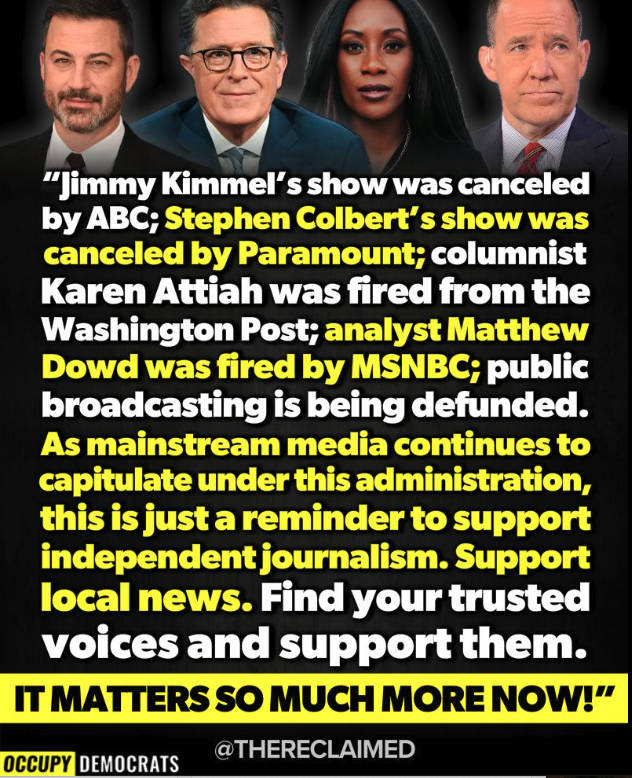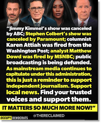 Media's MAGA makeover Trump-friendly billionaires are consolidating control over American media, steering legacy brands and social platforms in a new conservative direction. Why it matters: The media landscape of 2016 is unrecognizable. Once dominated by critics of President Trump, today's fragmented ecosystem is increasingly controlled - or threatened - by forces aligned with the White House. Driving the news: ABC pulled Jimmy Kimmel off air "indefinitely" on Wednesday in response to the late-night host's comments about Charlie Kirk's assassination. The extraordinary move came after Federal Communications Commission chair Brendan Carr warned ABC that it could face fines or license revocations if it did not "operate in the public interest." Trump celebrated Kimmel's removal - just as he did CBS's decision to cancel Stephen Colbert's show - and called for NBC to take action against remaining late-night hosts Seth Meyers and Jimmy Fallon. ... ... ... Read more ABC pulls Jimmy Kimmel after Charlie Kirk comments ABC is pulling Jimmy Kimmel after a wave of criticism over the late night host's recent comments in the wake of Charlie Kirk's killing. Why it matters: Kimmel is among the most high-profile people to face professional consequences for criticizing the conservative activist killed last week. What they're saying: An ABC spokesperson said in a statement to Axios, "Jimmy Kimmel Live will be pre-empted indefinitely." ... Read more Rump kills off 90% of Americans Rump kills off 90% of Americans (or manybe the World) | SC | 09/15/25 | 12:36Trump Raging at Epstein Ruining U.K. Visit Trump Raging at Epstein Ruining U.K. Visit: Michael Wolff | Inside Trump's Head | The Daily Beast | 09/17/25 | 41:05We warned you about Project 2025 We warned you about Project 2025. Well, it’s here... | MSNBC | 09/15/25 | 12:36 |