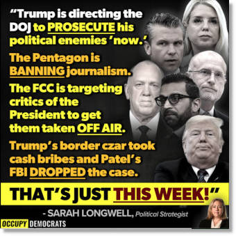 Trump slams "radical left" after signing "organized political violence" memo President Trump signed a presidential memorandum on countering "domestic terrorism and organized political violence" on Thursday. Why it matters: Trump sought to tie the action to the "radical left," singling out Democratic Party donors George Soros and Reid Hoffman when asked by a reporter what names came to mind that may need investigating. ACLU issued a statement saying the memo is part of Trump's "larger pattern of abusing his power to target critics through invocations of law enforcement, national security, and financial sanctions authorities." Driving the news: The memo is part of a wider crackdown on left-wing groups in the wake of Charlie Kirk's killing earlier this month that saw Trump sign an executive order designating the decentralized, leaderless antifascist movement antifa a "domestic terrorist organization." ... Read more RFK Jr. sets off new abortion alarms The Trump administration is facing conflicting political pressures after Health Secretary Robert F. Kennedy Jr. said the Food and Drug Administration will "study" adding safety restrictions on abortion pills. Why it matters: New limits like requiring in-person prescribing of the widely used abortion drug mifepristone would severely limit access to abortion in states with bans. Between the lines: An FDA safety review sits well with many in the Republican base who are strongly anti-abortion and are pushing hard for new restrictions. On the other hand, President Trump repeatedly pledged during the campaign last year that he would leave abortion policy to the states, to push back against Democratic charges that he would seek a nationwide ban. ... Read more Christian Nationalism The REAL Problem with Christian Nationalism | Holy Post Media | 2024 | 10:22AI Analysis of Rumps UN Speech I Let AI Break Down Trump's NONSENSE at the UN. The Result Will Surprise You | I Ask AI | 09/24/25 | 13:30United States National Debt is now $36,000,000,000,000 dollars US Debt of $30 Trillion Visualized in Stacks of Physical Cash | Demonocracy Info | 09/20/25 | 17:07